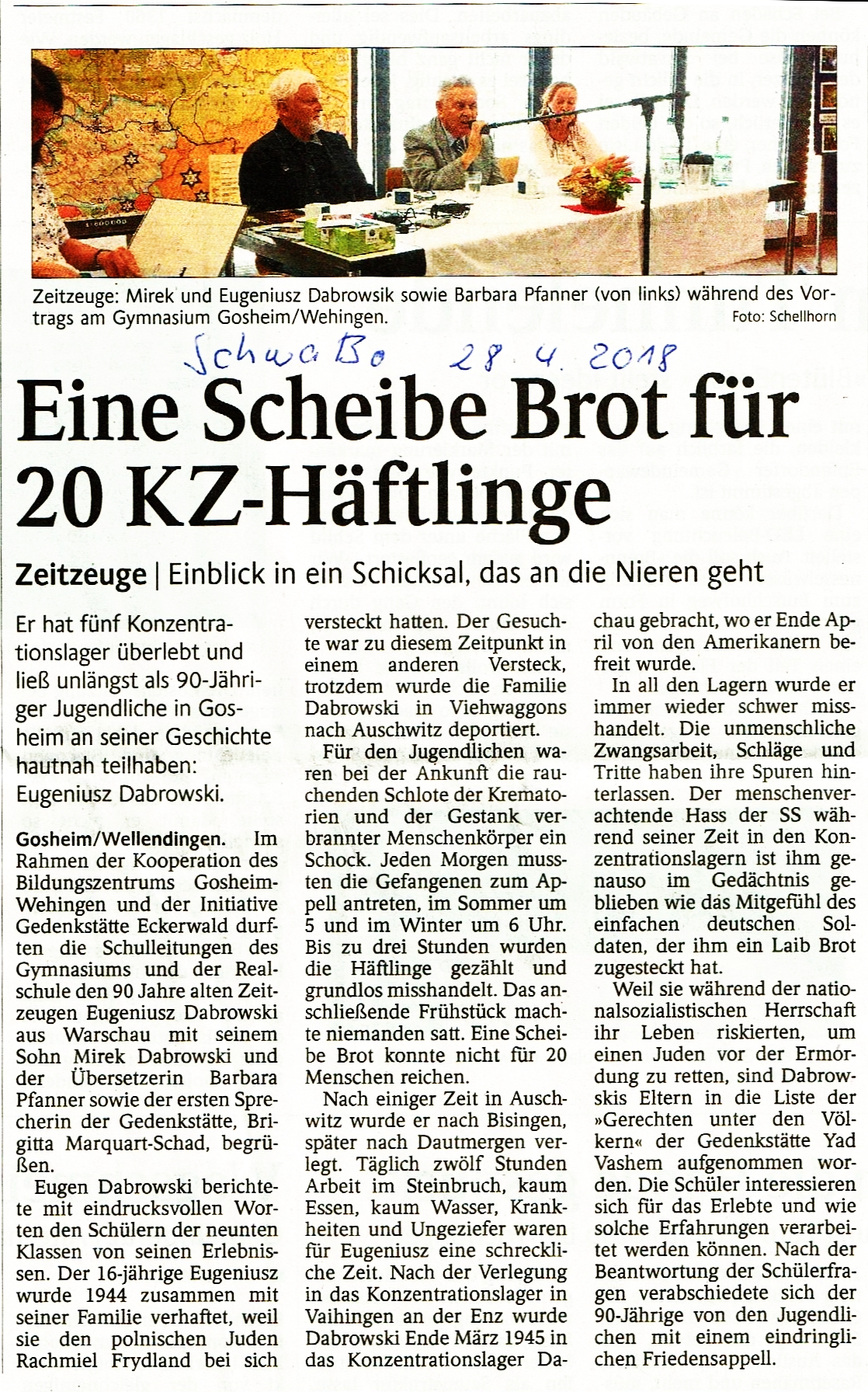 Eine Scheibe Brot für 20 KZ-Häftlinge, Zeitzeuge / Einblick in ein Schicksal das an die Nieren geht SchwaBo 27-4-2018 (1,7 MiB)