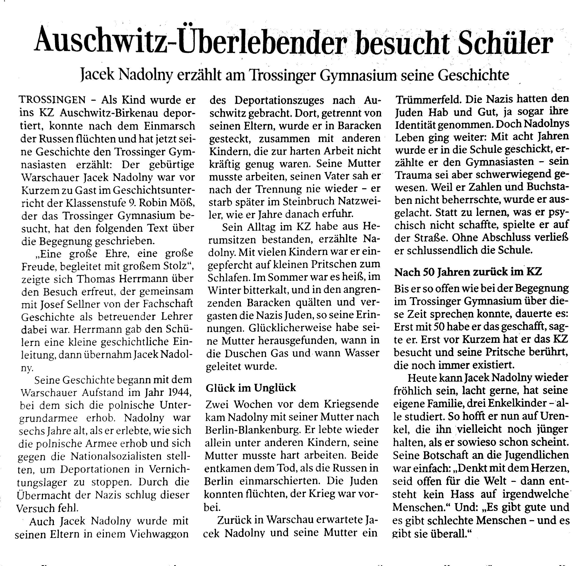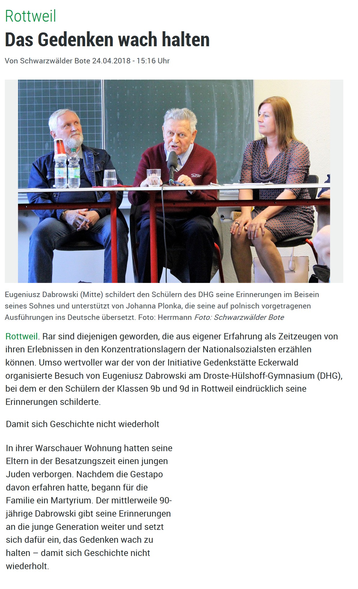 Das Gedenken wachhalten Eugeniusz Dabrowski schildert den Schülern des DHG seine Erinnerungen Schwarzwälder Bote 24.04.2018 (538,7 KiB)